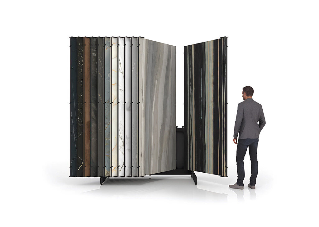 Book 224 Slimshow è un espositore di piastrelle di grande formato che segue lo stile del book INSCA. È possibile esporre piastrelle di 240, 260 e 280 cm di altezza e 120 cm di larghezza. Dispone di 12 pannelli girevoli su entrambi i lati. Uno dei grandi vantaggi di questo espositore di grande formato è che consente la piena visibilità dell'espositore, in quanto l'arredamento è ridotto al minimo.