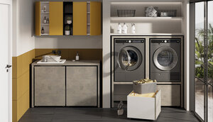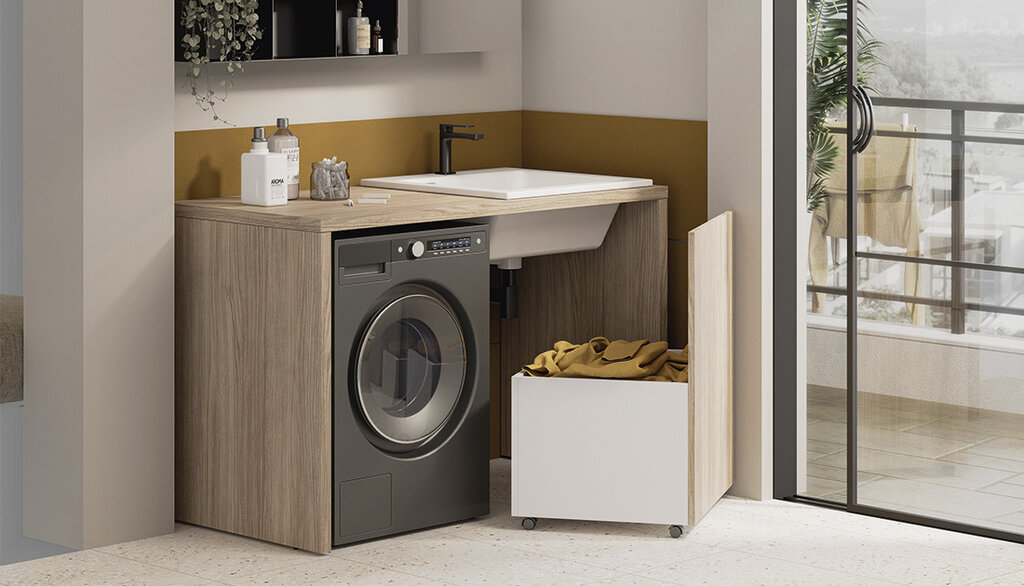 I bagni di Xilon sono bagni ibridi, belli e pratici, che spesso uniscono le funzioni del bagno classico a quelle della lavanderia. Laundry Shelf si riconosce subito, una soluzione alternativa per secondi bagni e lavanderie. Il mobile ha una struttura a ponte, che può essere lasciata vuota o riempita con dei pratici contenitori su ruote, da usare come portabiancheria o per riporre oggetti utili. Il mobile è spazioso e permette di installare il lavabo in ceramica Nanco 60×60 cm, disponibile sia con pareti lisce sia con lo strizzatoio.