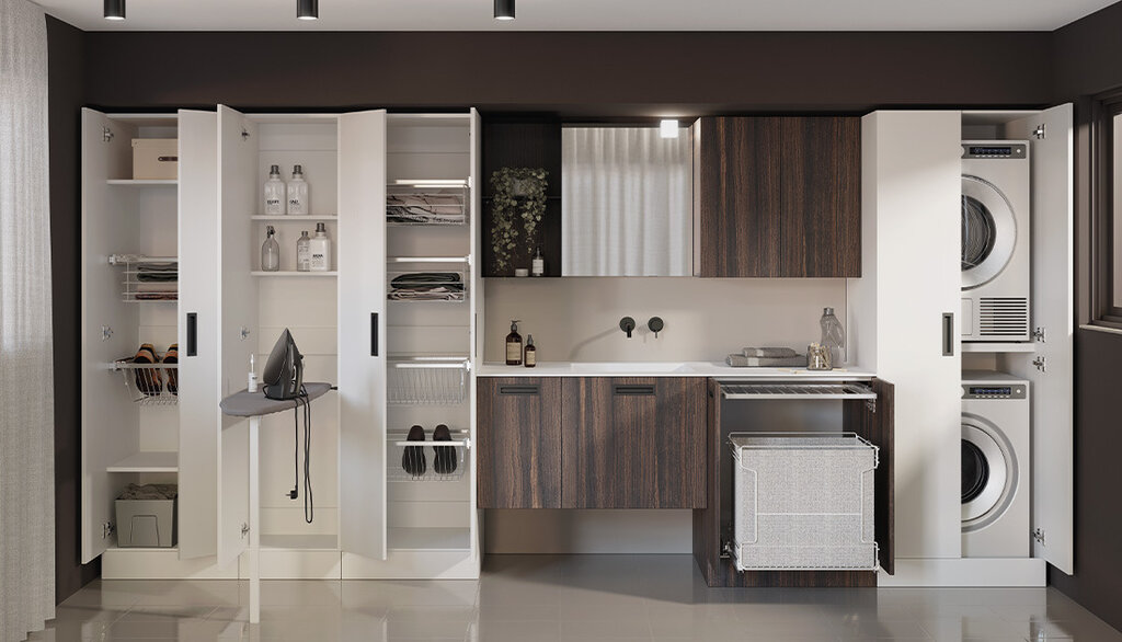 Totus rappresenta la lavanderia contemporanea. Immaginatela come un mobile pieno di risorse per ogni tipo d’uso. Può essere molto grande, con una profondità massima di 70 cm, ma anche piccola, con una profondità minima di 46 cm. Al suo interno trovate cesti, grucce, ripiani, portabiancheria, contenitori, mensole e assi da stiro; oltre a colonne contenitive per la lavatrice e l’asciugatrice. Una lavanderia funzionale e bella da vedere, dal design contraddistinto, caratterizzato dal top in ocritech spesso 1 cm.