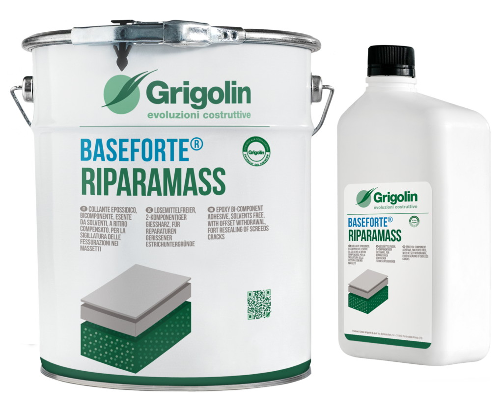 Adesivo epossidico bicomponente colabile, per la sigillatura monolitica delle riprese di getto e delle fessurazioni nei massetti cementizi, in anidrite e in calcestruzzo.