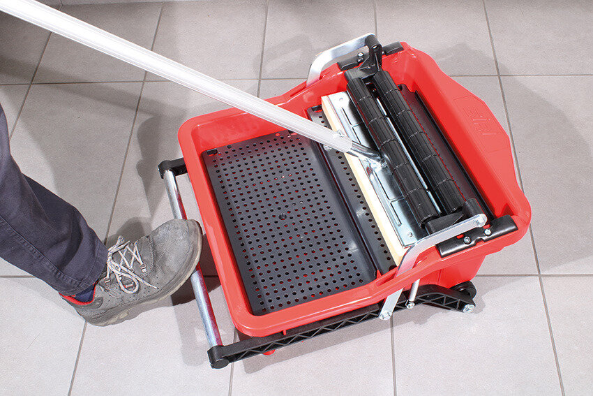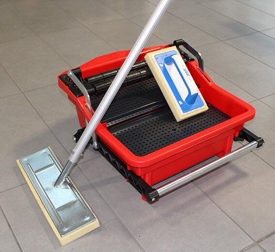 Vaschetta per pulizia di pavimenti e rivestimenti; dotata di vasca lt.32 con ruote – doppio sistema strizza spugna, con pedale e con due rulli – due ruote e due piedi in gomma antiscivolo – due frattazzi spugna hidro (uno per pavimenti cm 42x13x3 con manico scomponibile in alluminio – e uno per rivestimenti cm 27x13x3).