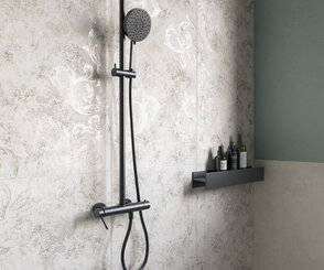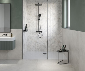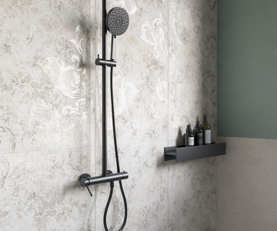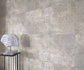 Toni soft si intrecciano con motivi geometrici e floreali quasi impercettibili, conferendo carattere alla superficie. La particolare finitura, che alterna lucido e opaco, aggiunge sensazioni materiche di straordinaria ricercatezza.