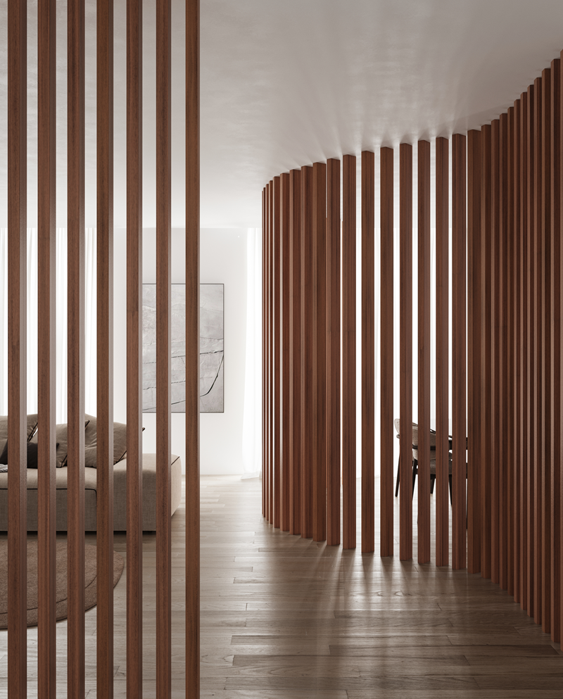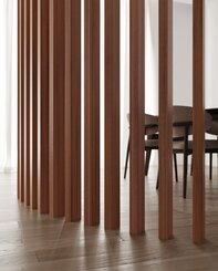 Listelli in legno ad incastro per realizzare separé e divisori. Ferramenta di montaggio completamente invisibile. Possibilità di ruotare i singoli listelli.