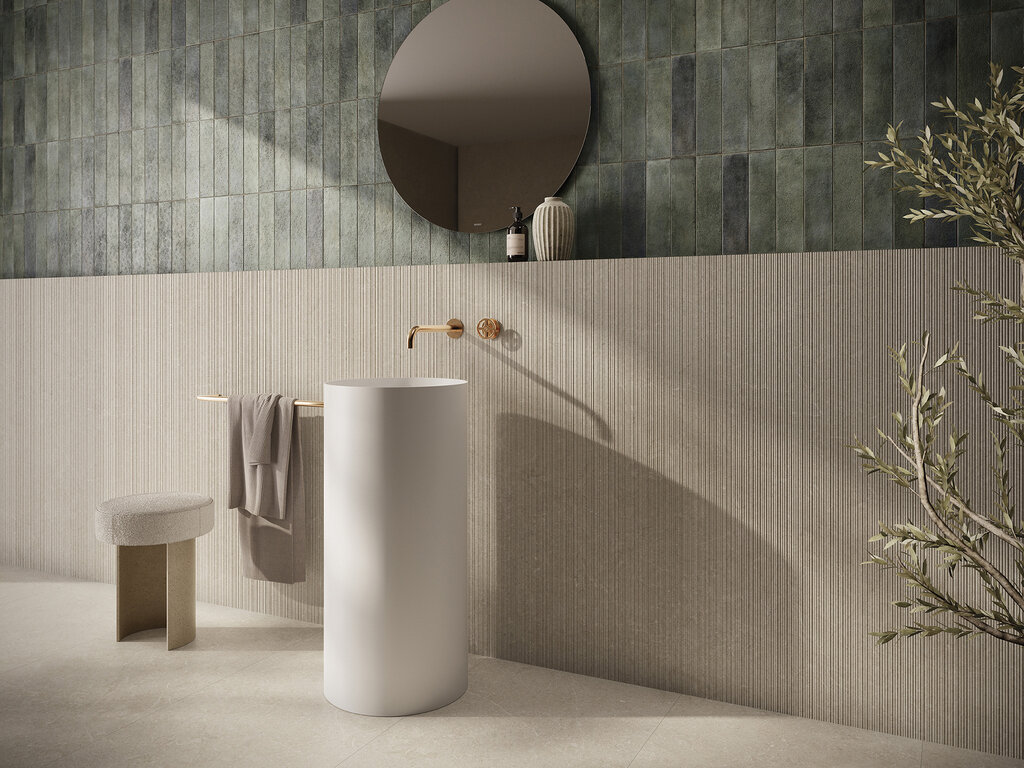 La finitura opaca esalta i rilievi e moltiplica la sensazione tattile, mentre le versioni antiscivolo consentono di estendere la collezione a terrazze, zone umide ed esterni. Un elemento decorativo in rilievo completa la serie, aggiungendo dinamismo e volume alle pareti d'accento.
