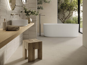 La collezione incorpora finiture antiscivolo per pavimenti esterni o zone umide, garantendo continuità tra interni ed esterni.