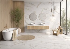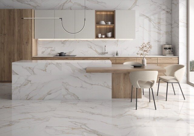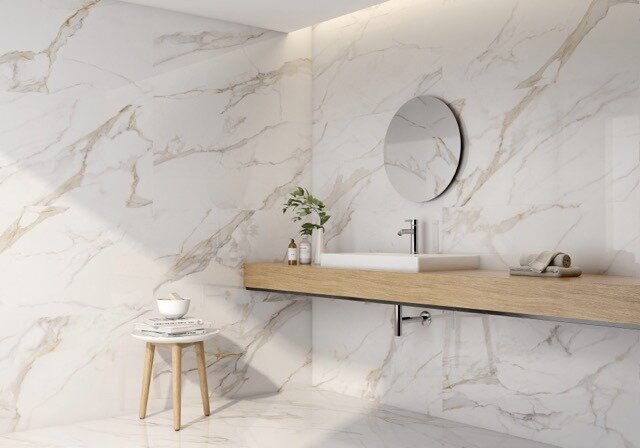 Marble Calacatta è disponibile anche nei grandi formati 120x250 e 120x120, in finitura lucida e opaca.