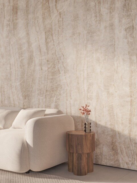 La collezione è disponibile in due formati di grande espressività, 120 × 250 cm e 120 × 120 cm, pensati per rivestire sia superfici verticali sia pavimenti, creando ambienti avvolgenti, luminosi ed eleganti. La sua finitura setosa, con leggere variazioni di texture, dialoga con gli stili architettonici sia classici che contemporanei.