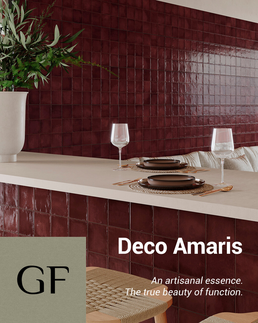 La gamma cromatica si amplia in Deco Amaris con quattro tonalità vibranti e intense — Burdeos, Cocoa, Forest e Navy — che riflettono l’essenza del lato più decorativo di Gayafores. Queste proposte ampliano le possibilità creative e conferiscono carattere distintivo ai progetti, riaffermando la ceramica come risorsa espressiva e versatile nel design d’interni contemporaneo.
