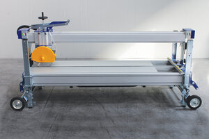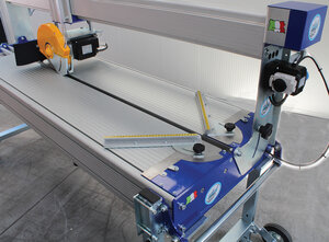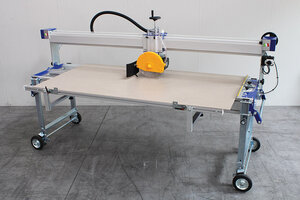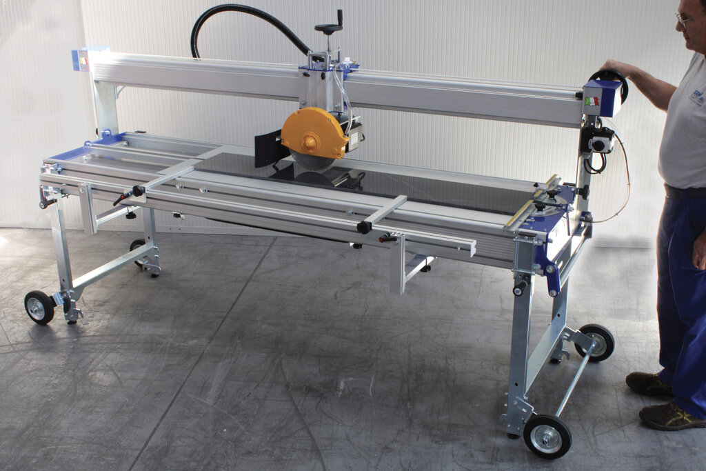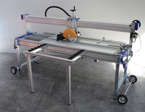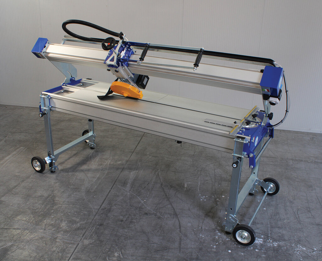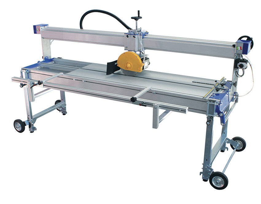 Taglierina a ponte con incluso disco Ø mm 250 x 25,4 a settori ravvicinati, specifico per piastrelle in porcellanato, anche di alto spessore. Lunghezza massima di taglio cm 120 - 160 - 200. Con dischi specifici è possibile tagliare anche marmo e granito, fino ad un’altezza massima di cm 5.