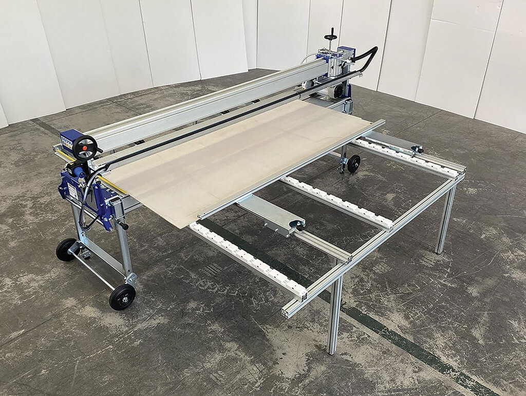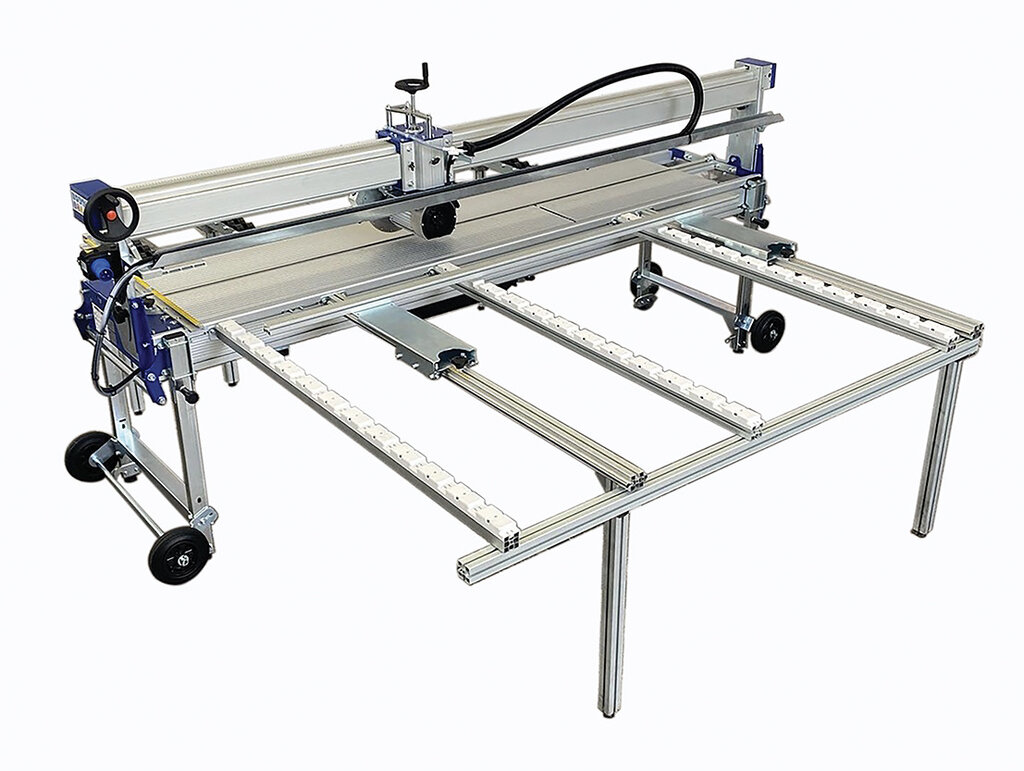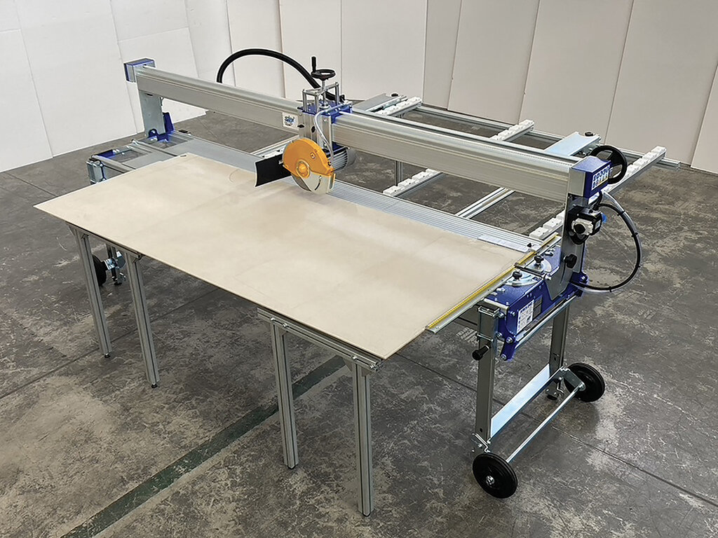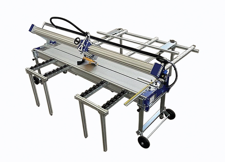 Taglierina per il taglio di grandi formati, con disco diamantato specifico Ø mm 250 x 25,4 a settori ravvicinati, per piastrelle in porcellanato, anche di alto spessore fino ad un’altezza massima di cm 5. Dotata di avanzamento motore con volantino e di supporto laterale con contro squadro. Lunghezza massima di taglio cm 240 - 320. E’ possibile tagliare anche marmo e granito con dischi specifici.