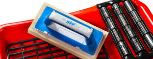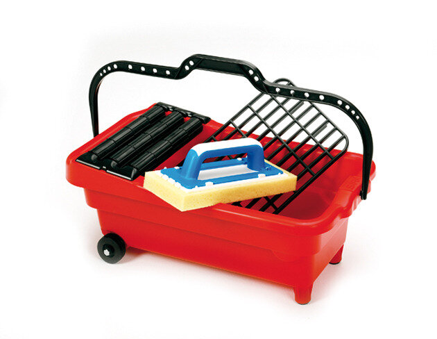 Vaschetta lt. 15 con ruote 3 rulli, griglia, ruote, piedini in gomma antiscivolo e frattazzo spugna.
