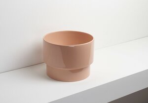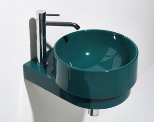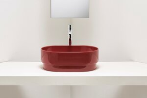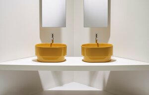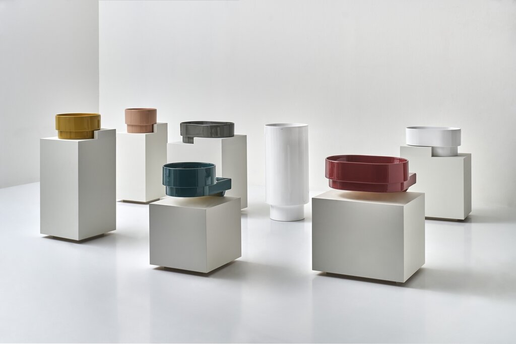 PO•MO collezione di lavabi da appoggio, sospesi e free-standing, design Terri Pecora, la cui estetica è distinta da un "gradino" alla base di ogni pezzo. Due le forme: il tondo e l’ovale, con diverse dimensioni nella base come nell’altezza: i tondi Ø37xH19cm, Ø33xH24cm, e gli ovali 56x37xH19cm, 50x33xH24cm, più due lavabi sospesi con basetta posteriore, uno tondo Ø37x43xH19cm e uno ovale 56x43xH19cm, più due lavabi freestanding Ø40xH85. Vasta la gamma cromatica con 19 finiture tra lucide e Matt.